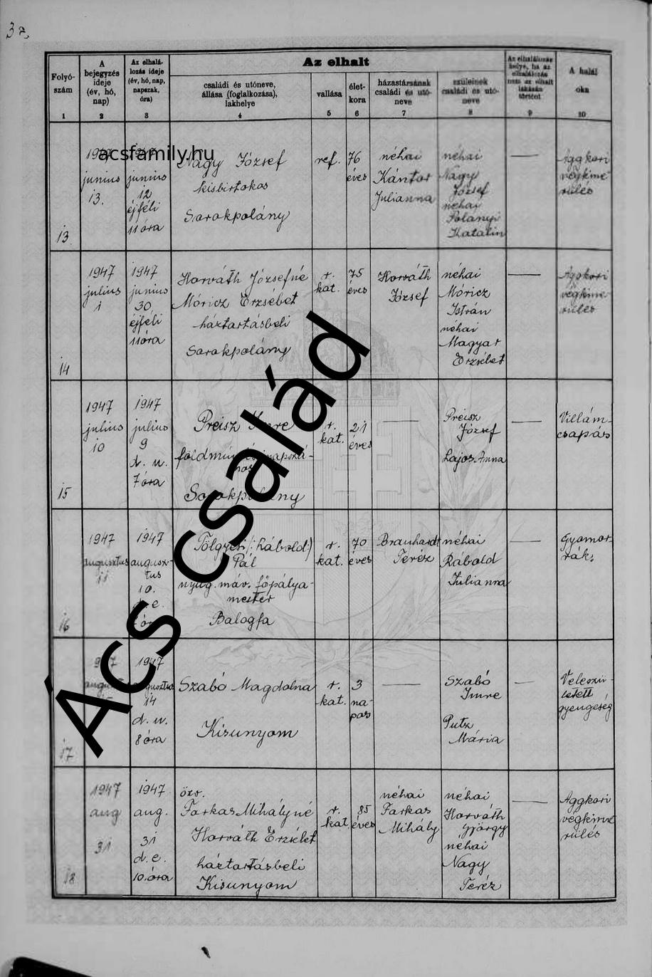 | Lánygyermek halála | Szabó Magdolna 1947. augusztus 14. (Életkor 25 év) Életkor: 3 napos Ok: Veleszületett gyengeség |