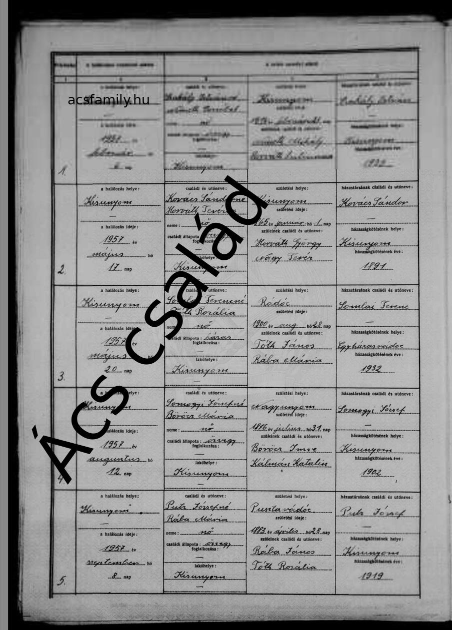 | Anya halála | Rába Mária 1957. szeptember 08. (Életkor 35 év) |