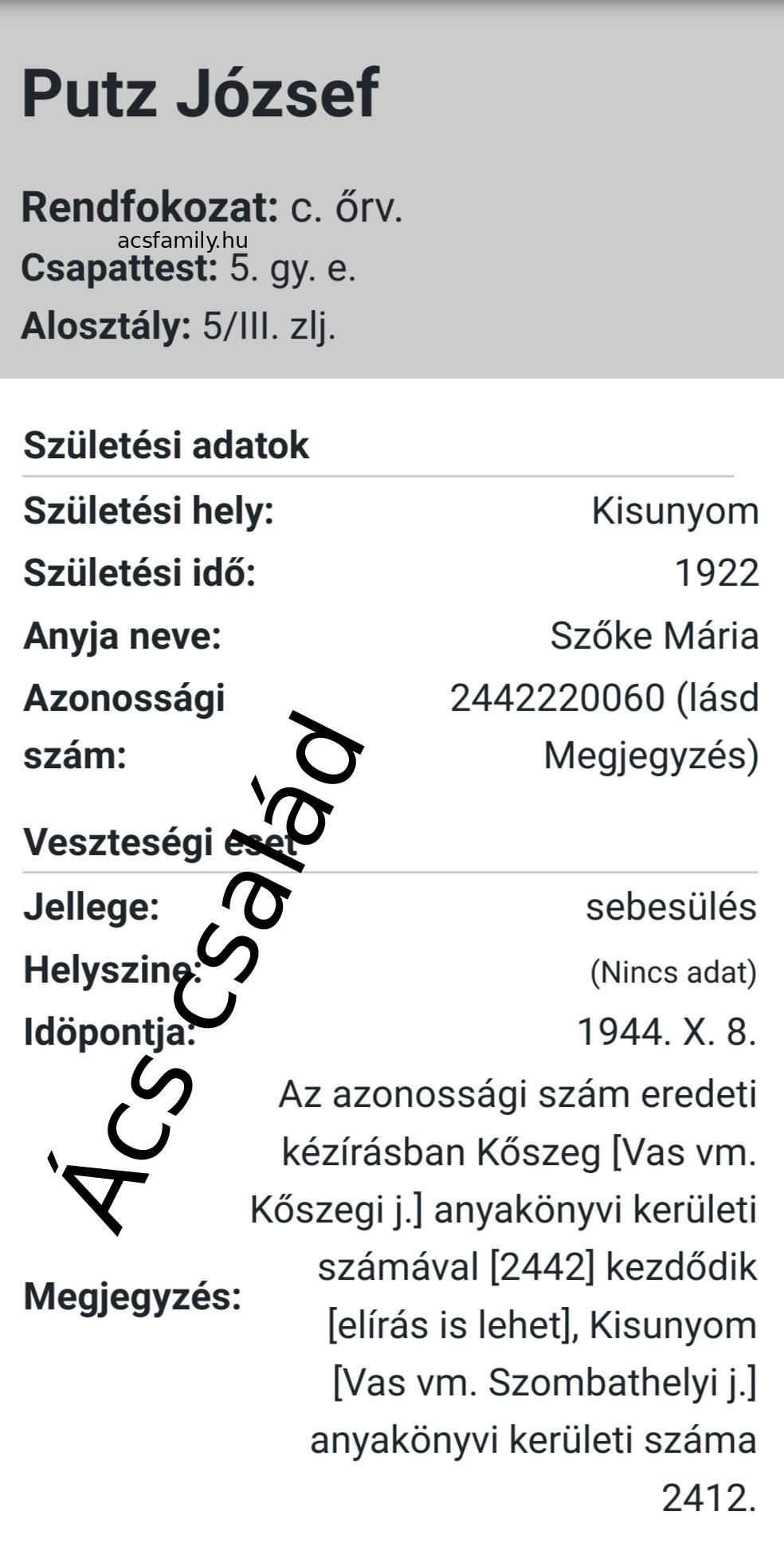 Születés: 1897. december 19. 34 27 — Csempeszkopács, Vas Elhalálozás: 1946. augusztus 25. — Kisunyom, Vas |